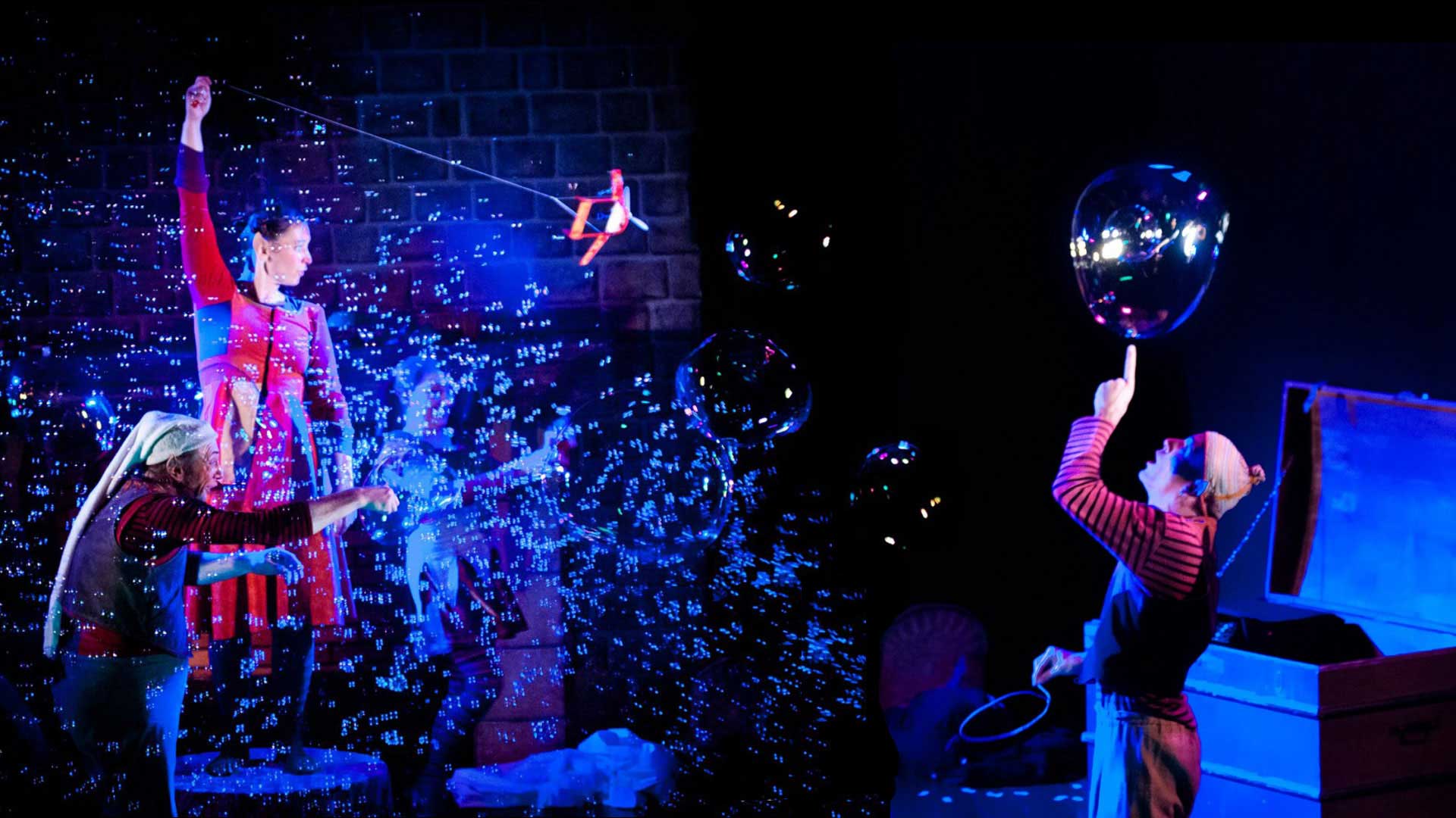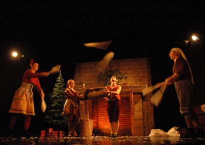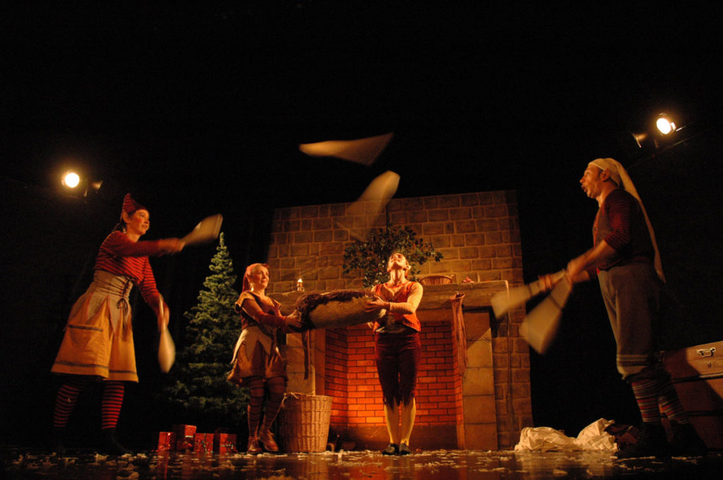 “Eblouissante performance d’une compagnie qui fait appel à toutes les disciplines du spectacle. Utilisant les technique des arts de la rue et du transformisme humoristique, les comédiens jonglent, dansent et racontent sobrement une histoire ponctuée de bouffonnerie poétiques : celle du Père Noël et de ses lutins. Le récit en pointillé alterne avec des séquences silencieuses, purement visuelles, dont la virtuosité reste bouche bée: jeu de boules lumineuses, danse de bulles de savon, transformation d’un simple drap blanc en démon des vents ou en forêt d’automne. Un grand spectacle où se cache discrètement un message de sagesse.“
